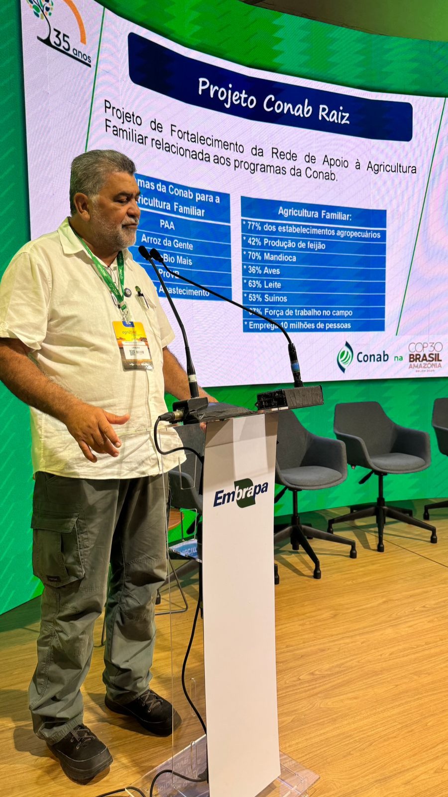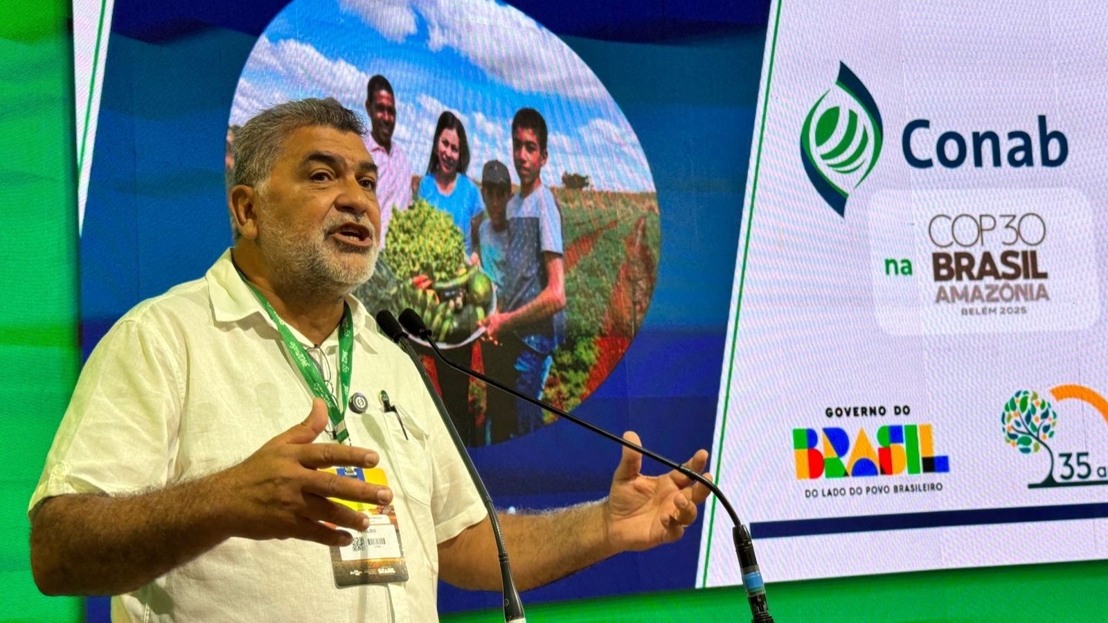 O diretor de Desenvolvimento, Inovação e Gestão de Pessoas da Companhia Nacional de Abastecimento (CONAB), Lenildo Morais, apresentou nesta terça-feira (19), no Auditório 1 da Agrizone, as principais estratégias da instituição para ampliar a inovação tecnológica voltada à agricultura familiar. A participação integrou a programação oficial da COP30, reforçando o compromisso do Brasil em promover sistemas alimentares sustentáveis e resilientes às mudanças climáticas.