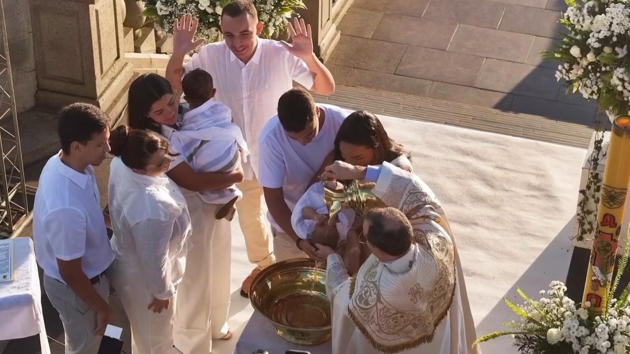 Diante do Cristo Redentor, o cantor João Gomes e a influenciadora Ary Mirelle viveram um dos momentos mais marcantes da vida em família: o batizado dos filhos Jorge, de um ano e nove meses, e Joaquim, de apenas 45 dias de vida.
