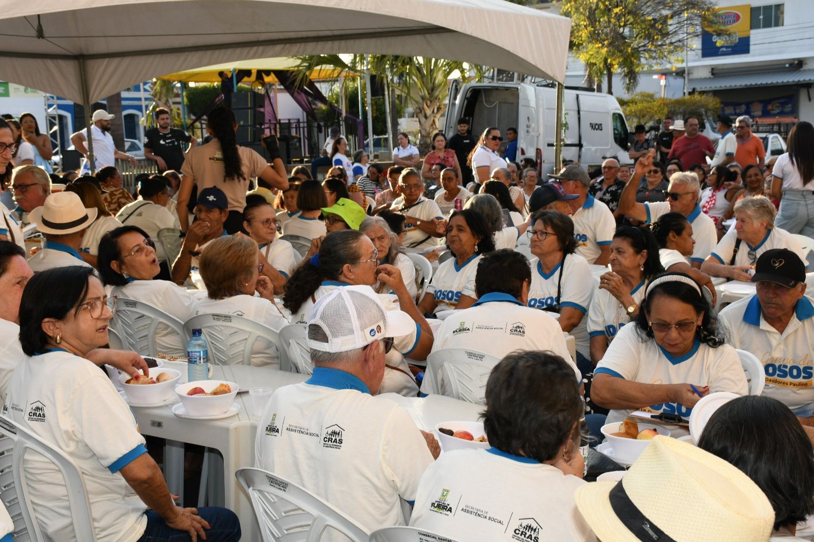 À noite, o clima de nostalgia tomou conta da praça com o Baile Anos 60, embalado pelo cantor Neguinho Show, que levou os participantes a dançar e cantar clássicos que marcaram gerações. O encerramento ficou por conta de um jantar especial, que coroou o dia com confraternização e sorrisos.