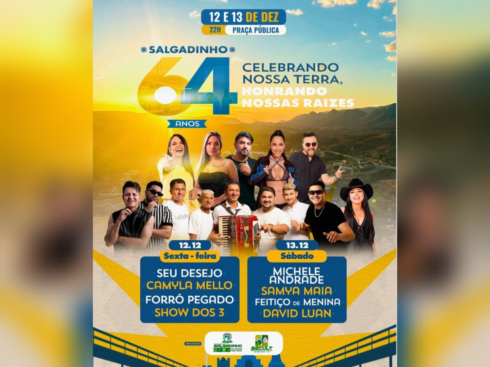 A Prefeitura de Salgadinho anunciou a programação oficial em comemoração aos 64 anos do município. As celebrações ocorrerão nos dias 12 e 13 de dezembro, a partir das 22h, na Praça Pública, reunindo artistas que são amados por todo Brasil.