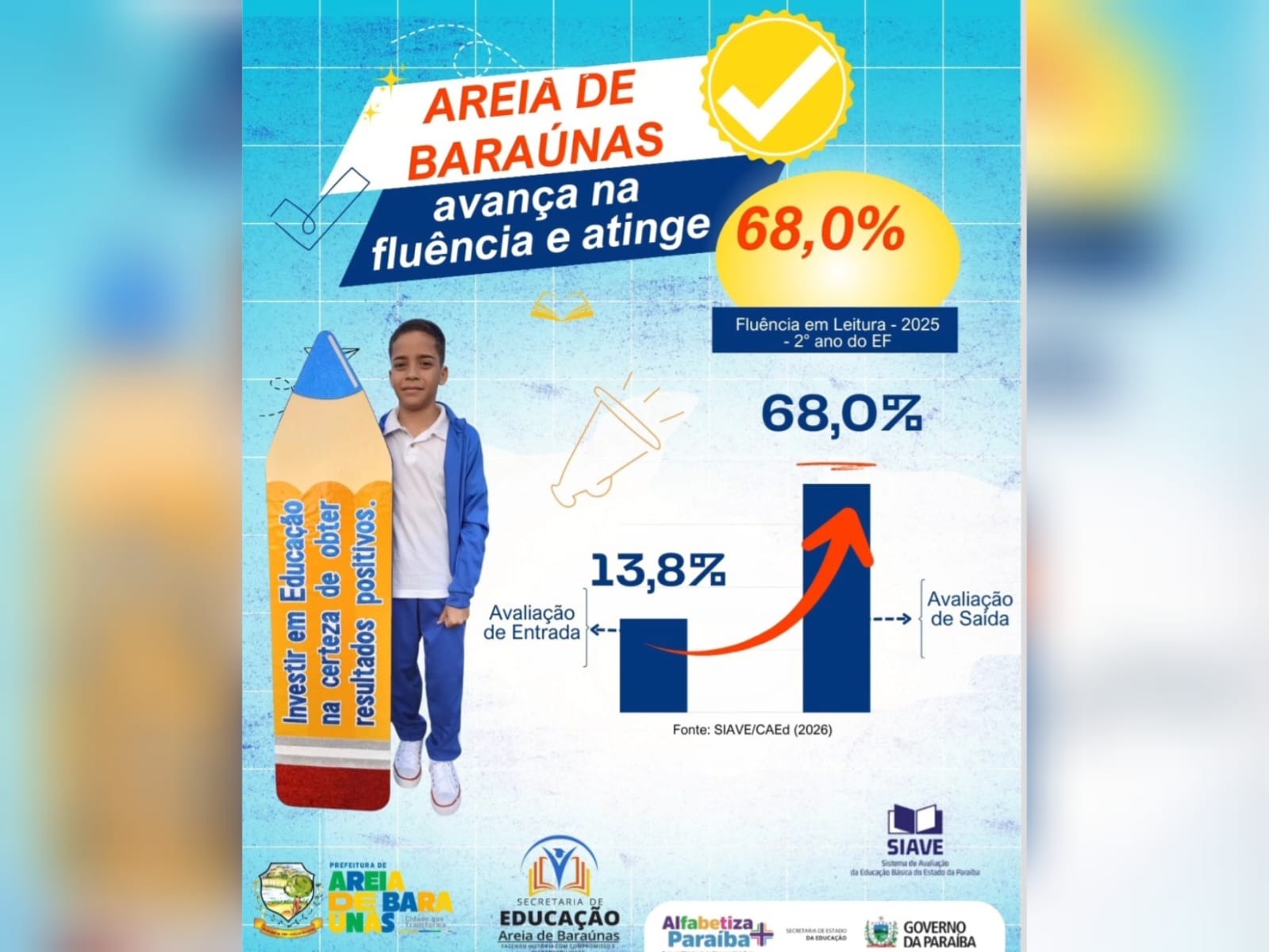 A Avaliação de Fluência em Leitura, realizada pelo Sistema de Avaliação da Educação Básica da Paraíba (Siave), do Governo do Estado, revela um avanço expressivo no desempenho dos estudantes do 2º ano do Ensino Fundamental da rede municipal de Areia de Baraúnas, após a conclusão da serie, no ano de 2025.