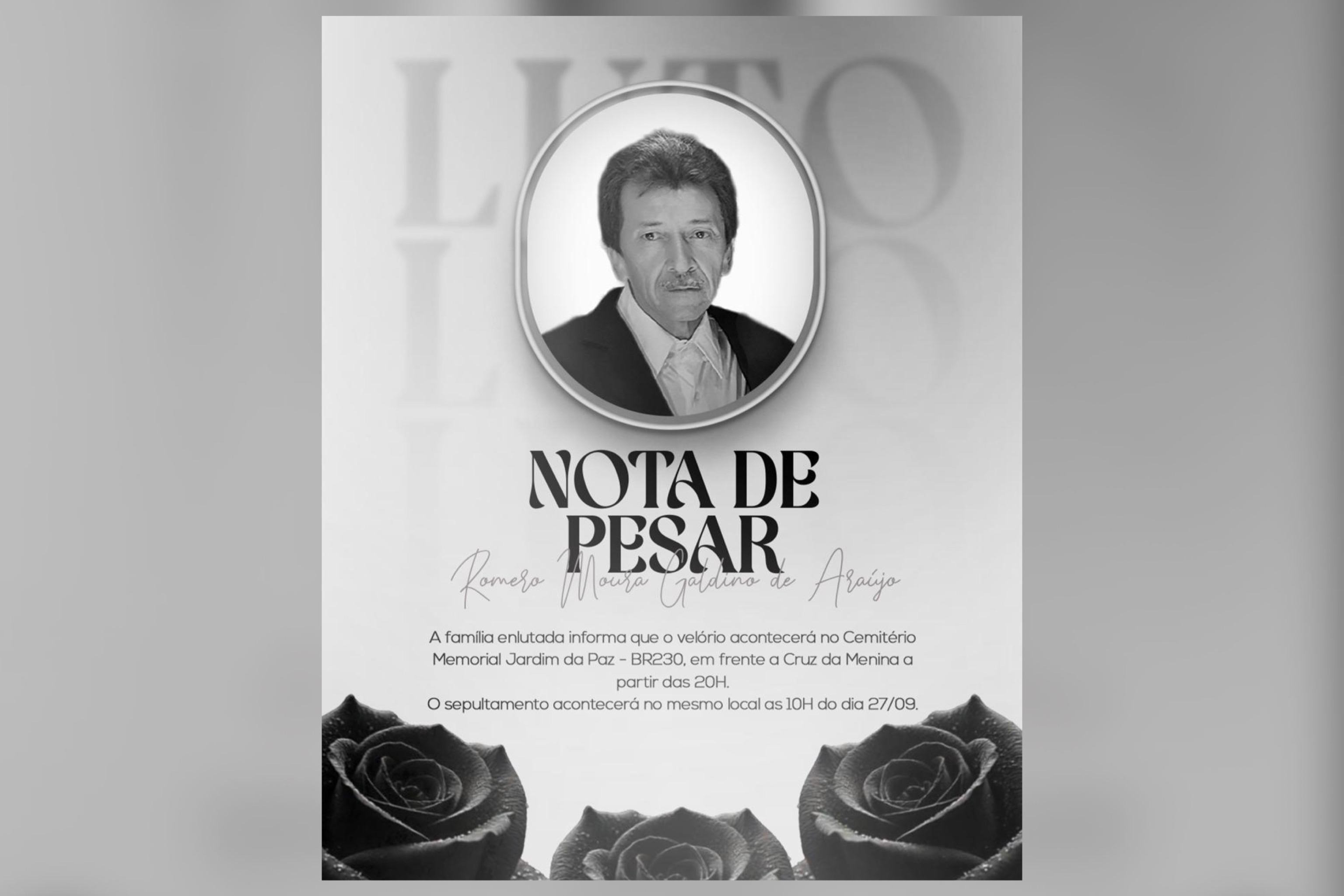 Romero Moura Galdino de Araújo, corretor de imóveis, faleceu na tarde desta sexta-feira (26), às 13h30, no Hospital do Bem, em Patos. Ele tinha sido diagnosticado com câncer de próstata em 2021, que evoluiu para metástase na coluna, e sofreu uma parada respiratória em decorrência do agravamento da doença.