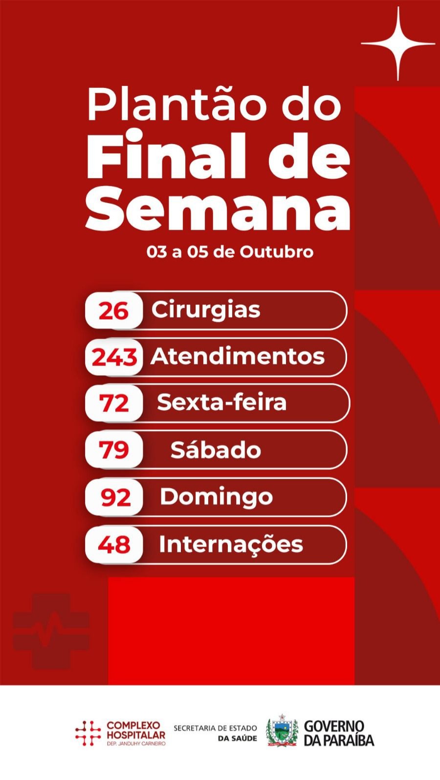 A Emergência e Urgência do Complexo Hospitalar Regional Deputado Janduhy Carneiro (CHRDJC), unidade da rede estadual de saúde, em Patos, registrou 243 atendimentos e realizou 26 cirurgias durante o plantão do último fim de semana, entre as 18h da sexta-feira (3) e a meia-noite do domingo (5). As cirurgias foram distribuídas entre 17 oncológicas, sete vasculares, cinco gerais, duas ortopédicas e uma urológica.
