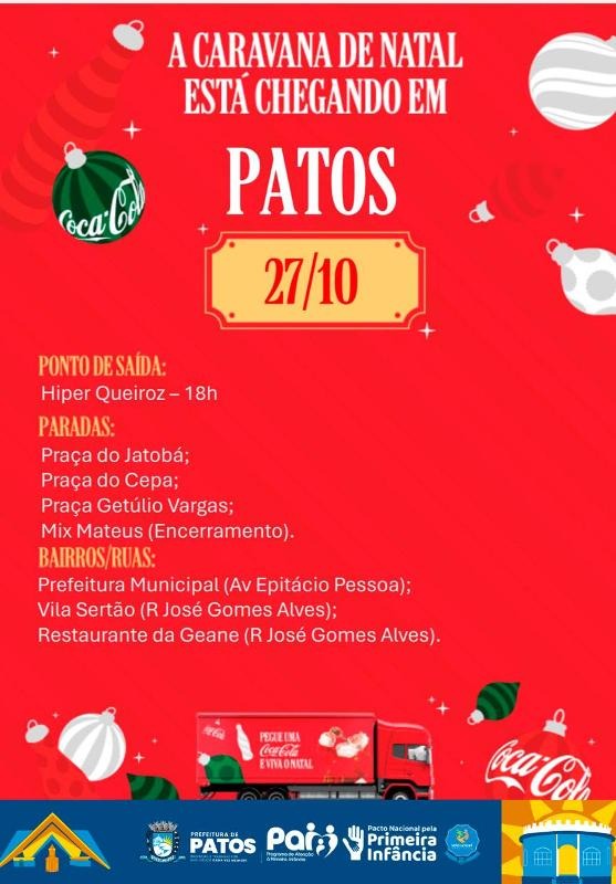 Na próxima segunda-feira, dia 27 de outubro, às 18h, a cidade de Patos vai receber a Caravana de Natal da Coca Cola, um lindo momento de fraternidade, luz e alegria que anunciam a chegada do período mais bonito do ano.