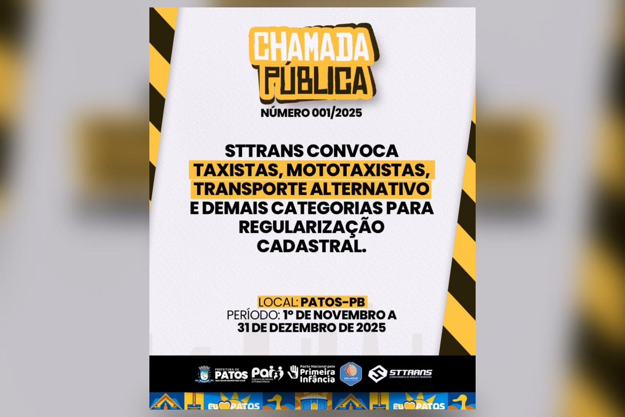 A Superintendência de Trânsito e Transporte de Patos – STTrans lançou edital de Chamada Pública Nº 001/2025 que convoca os concessionários de serviço público taxistas, mototaxistas, transporte alternativo, carro de frete (carga e descarga), transporte escolar e carro de som para o período de renovação de alvará que terá seu início na próxima, segunda-feira, 03 de novembro.