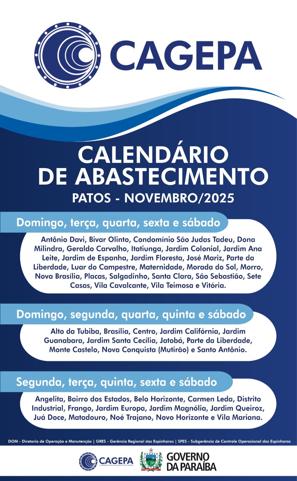 A Companhia de Água e Esgotos da Paraíba (Cagepa) informa que, a partir do dia 17 de novembro, será implantado o sistema de rodízio no abastecimento de água do município de Patos e região. A medida se deve à situação crítica dos mananciais que abastecem a maior cidade do Sertão paraibano.