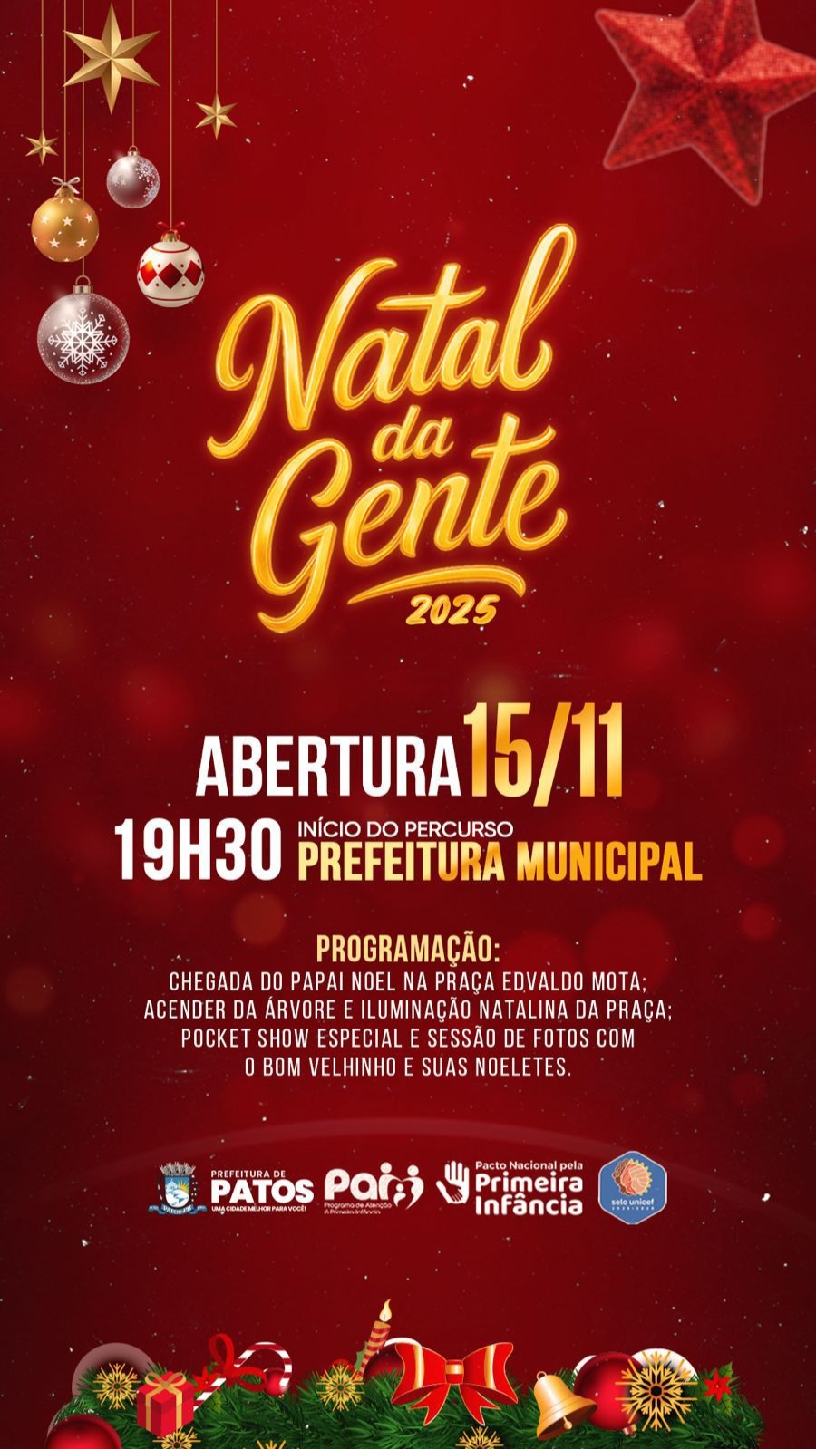A Prefeitura de Patos realizará, neste sábado, 15 de novembro, a abertura oficial do Natal da Gente 2025, marcando o início das celebrações natalinas na cidade. O evento contará com o acendimento das luzes da árvore e da praça Edvaldo Mota, o tradicional desfile do Papai Noel e um pocket show natalino na Concha Acústica.