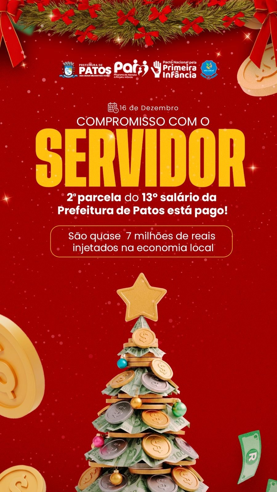A Prefeitura de Patos realizou, nesta terça-feira, 16 de dezembro, o pagamento da segunda parcela do 13º salário dos servidores municipais, aposentados e pensionistas. A ação reforça o compromisso da gestão com a valorização de quem contribui e já contribuiu com o serviço público municipal.
