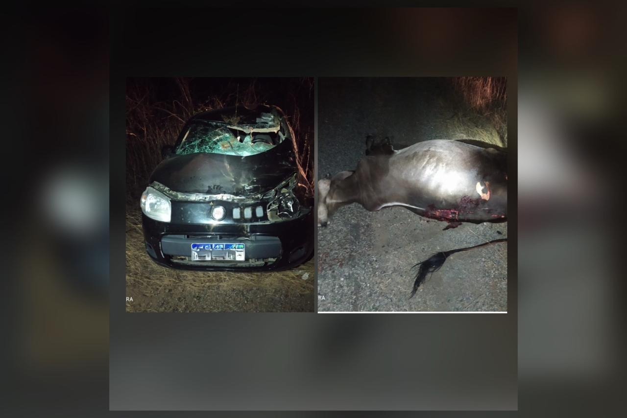 Na sequência, a motocicleta que seguia logo atrás também atropelou o bovino, o que provocou a queda dos dois ocupantes.