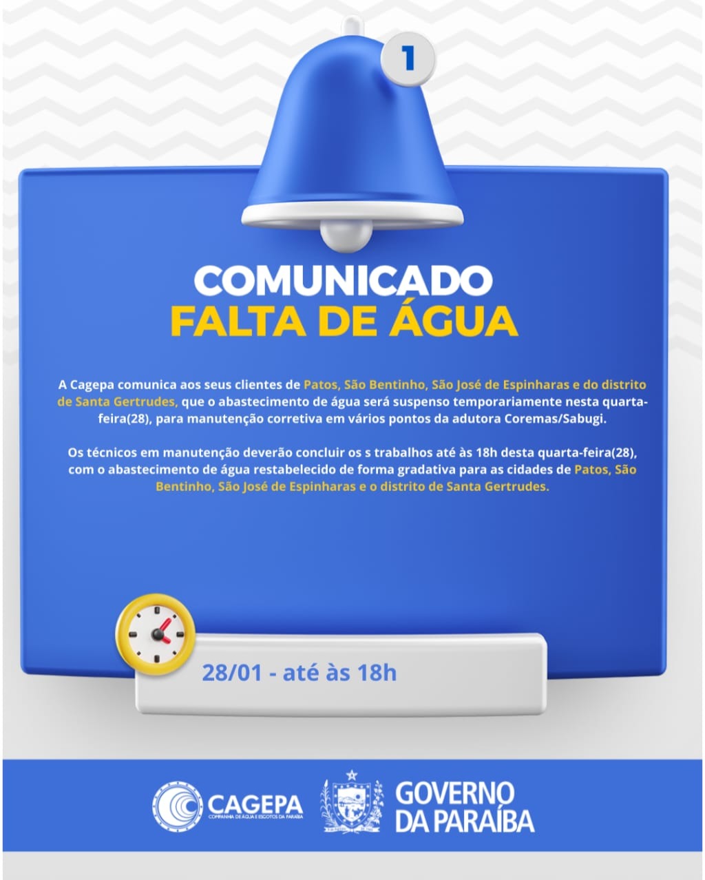 O abastecimento de água será temporariamente suspenso nesta quarta-feira (28) em Patos, São Bentinho, São José de Espinharas e no distrito de Santa Gertrudes. A interrupção ocorre por causa de uma manutenção corretiva em vários pontos da adutora Coremas/Sabugi, responsável pelo fornecimento para essas localidades do Sertão paraibano.
