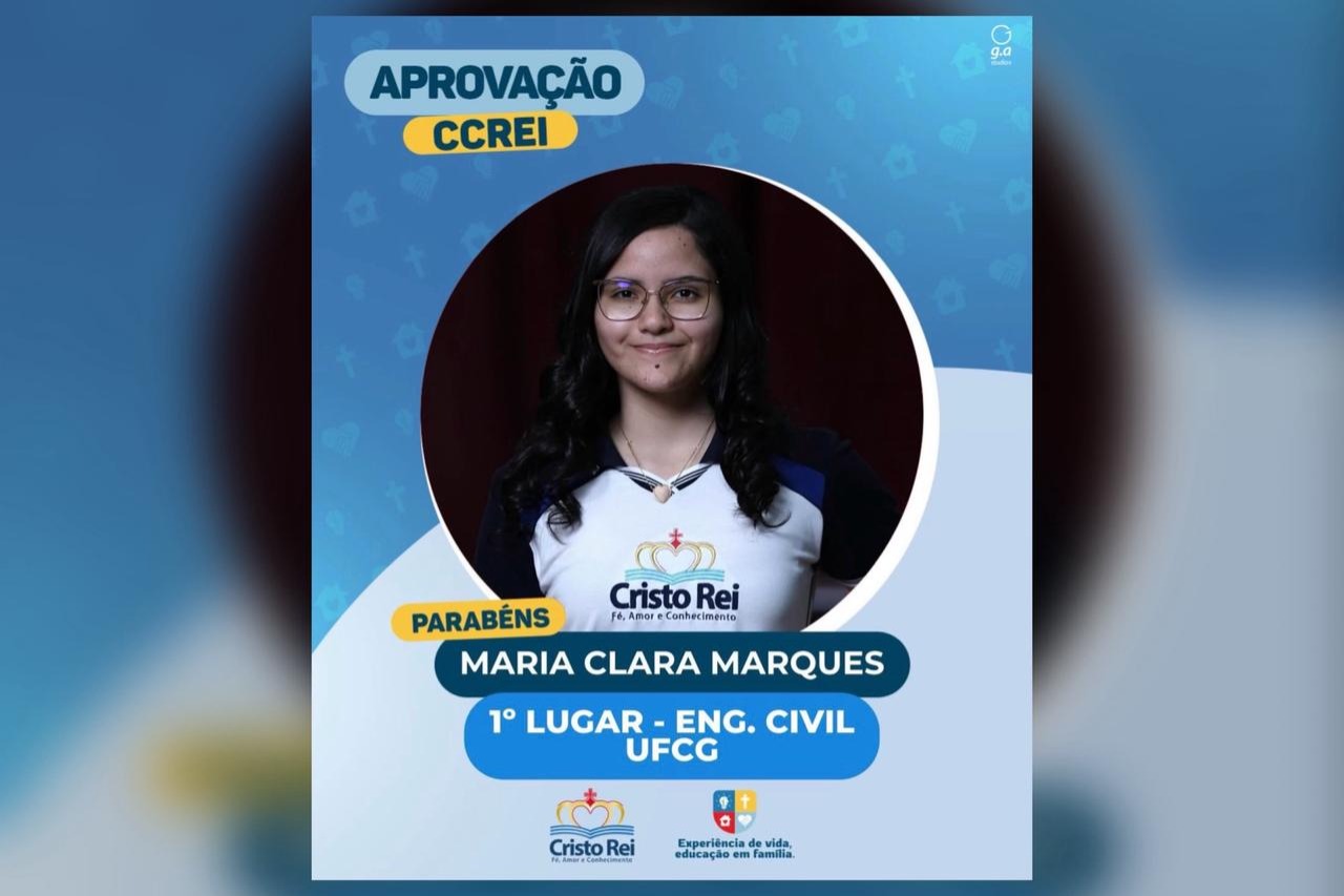 O resultado do Sistema de Seleção Unificada (Sisu), divulgado nesta quinta-feira (29), trouxe um destaque expressivo para a educação do interior da Paraíba. Maria Clara Marques, egressa do Colégio Cristo Rei, em Patos, conquistou o 1º lugar em Engenharia Civil na Universidade Federal de Campina Grande (UFCG).