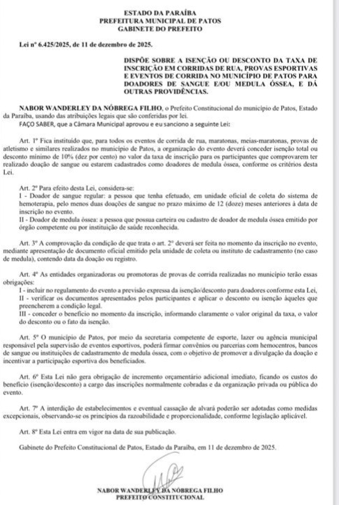 Uma lei sancionada pelo prefeito de Patos Nabor Wanderley garante isenção total ou desconto mínimo de 10% na taxa de inscrição em eventos de corrida realizados no município para doadores regulares de sangue e doadores de medula óssea. A medida é resultado de um Projeto de Lei de autoria da vereadora Fátima Bocão (Republicanos), aprovado pela Câmara Municipal e transformado em lei após sanção do Executivo.