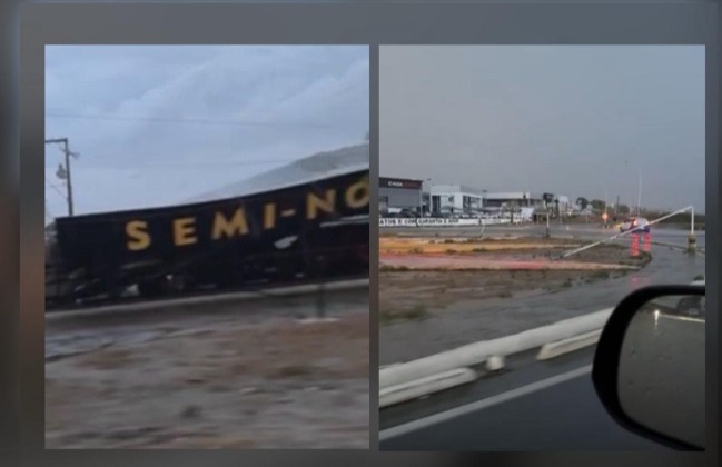 Além disso, os ventos também causaram prejuízos a um estabelecimento comercial. Toda a cobertura de uma concessionária de veículos, localizada nas proximidades do Atacadão, foi derrubada. Vídeos compartilhados nas redes sociais registraram o momento após o ocorrido e a extensão dos danos no local.