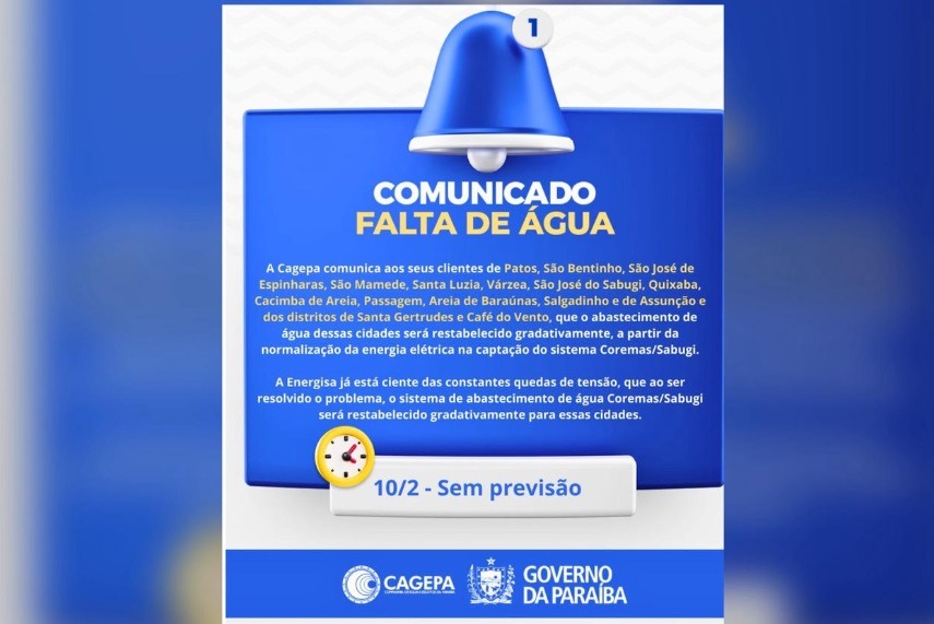 Ainda segundo o comunicado, o abastecimento dessas localidades será restabelecido de forma gradativa, a partir da normalização da energia elétrica na captação do sistema Coremas/Sabugi.